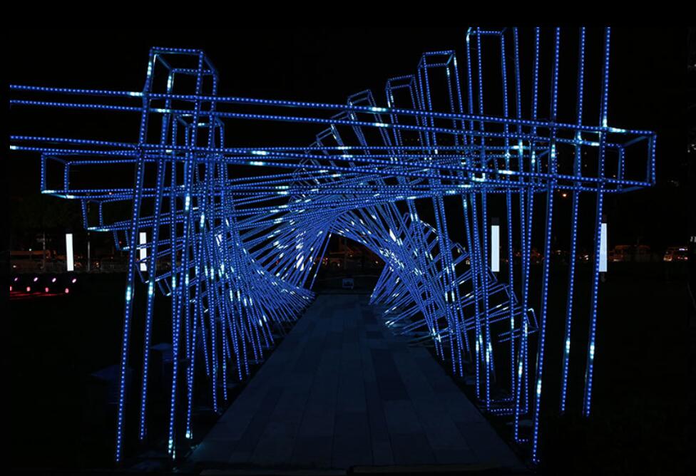 欧普景观亮化设计师从五维空间中螺旋状无限延伸的时间层次吸取灵感,创作出“光之通道”,它不仅是光影的通道,更是时光的隧道,更寓意着被智慧照亮的未来。同时,这一立体构成的表现手法,也与万象城打造的“城市立体空间”的概念不谋而合。